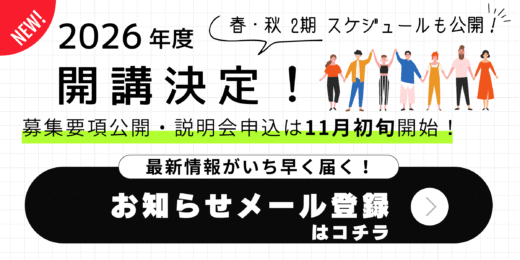 開催時期 | 年間2期開講 ※詳細なスケジュールは年度毎に異なります。 |